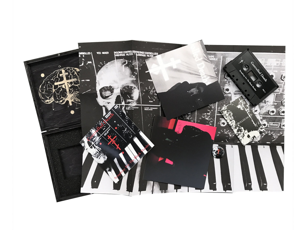 Black body (w/printing) tape in black wooden box with laser engraving and closure with magnet limited to 99 hand numbered copies w/business card, poster, sticker, pin and two cardboards.